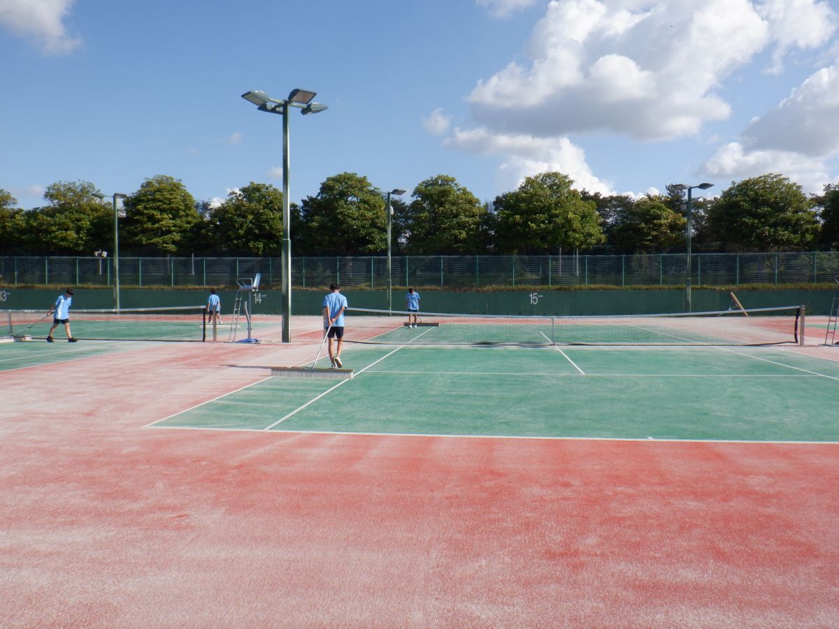 テニスコートのブラシ掛けを体験して頂きました。