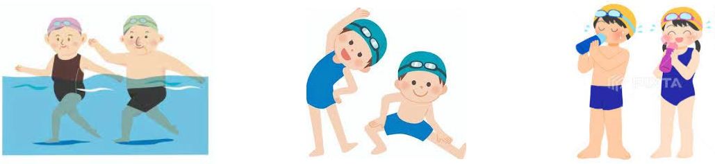 ※準備運動をしっかりとして水分補給も忘れずに行いましょう。終わった後も、クールダウンとして水中でのストレッチを行うと、筋肉の疲労回復を促して怪我の予防に繫がります。