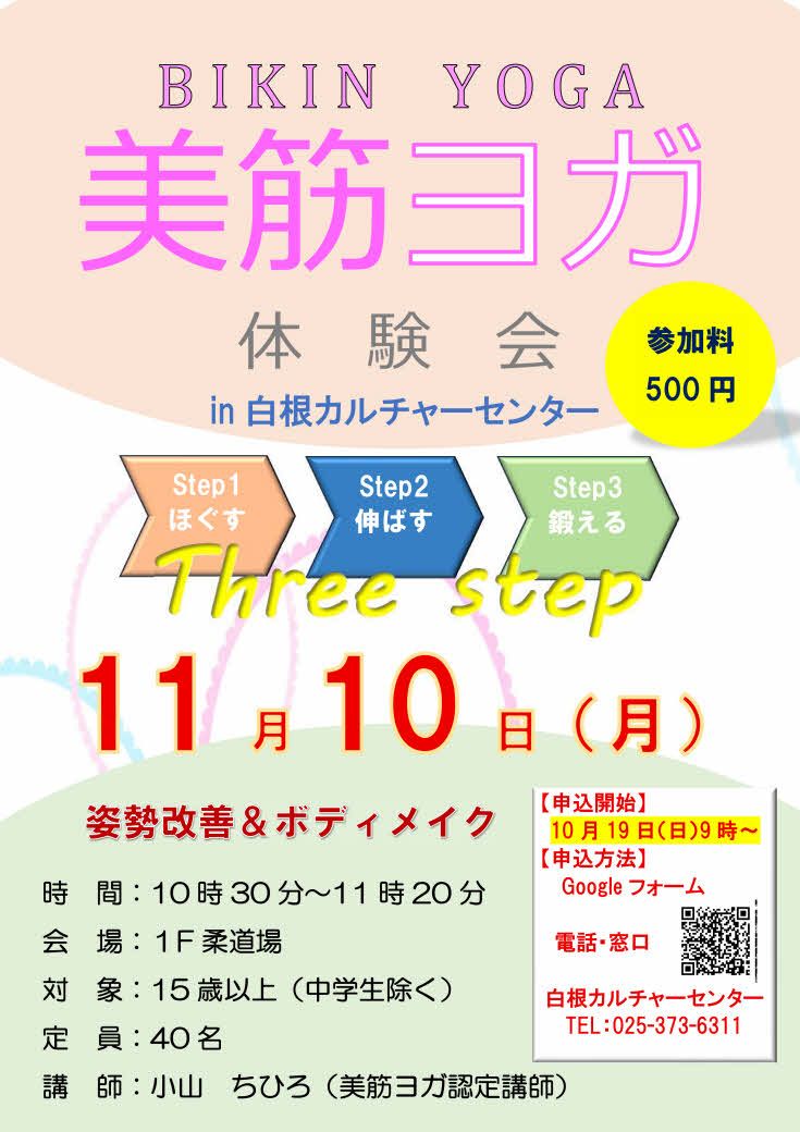 11/10(月)に美筋ヨガ体験会を開催いたしますのでお知らせいたします。