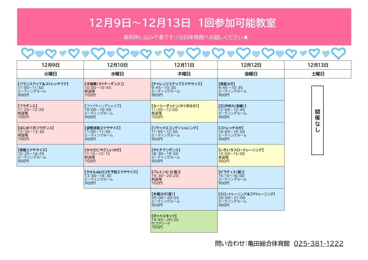 2025/12/07【12/9~12/13】スポーツ教室1回参加可能教室のお知らせ