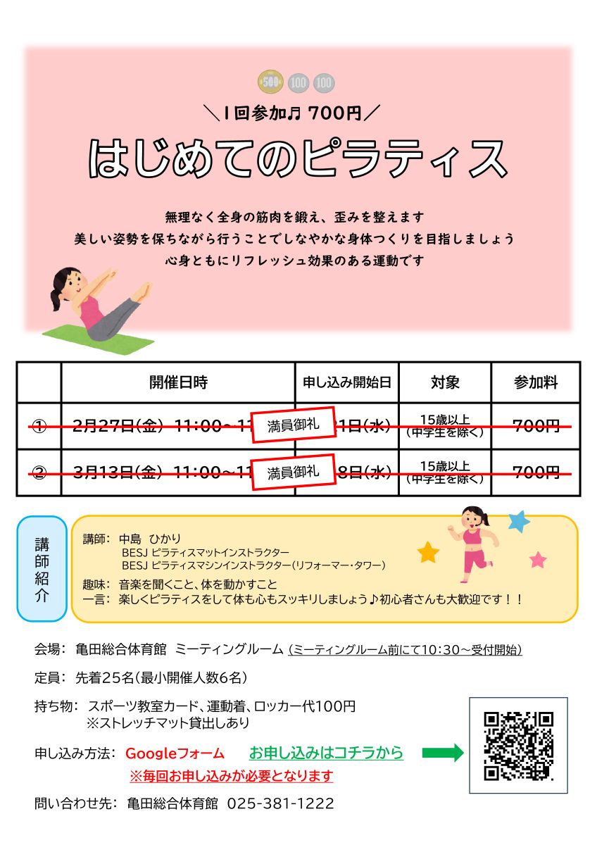 2026/03/01【3月】『はじめてのピラティス』満員となりました!