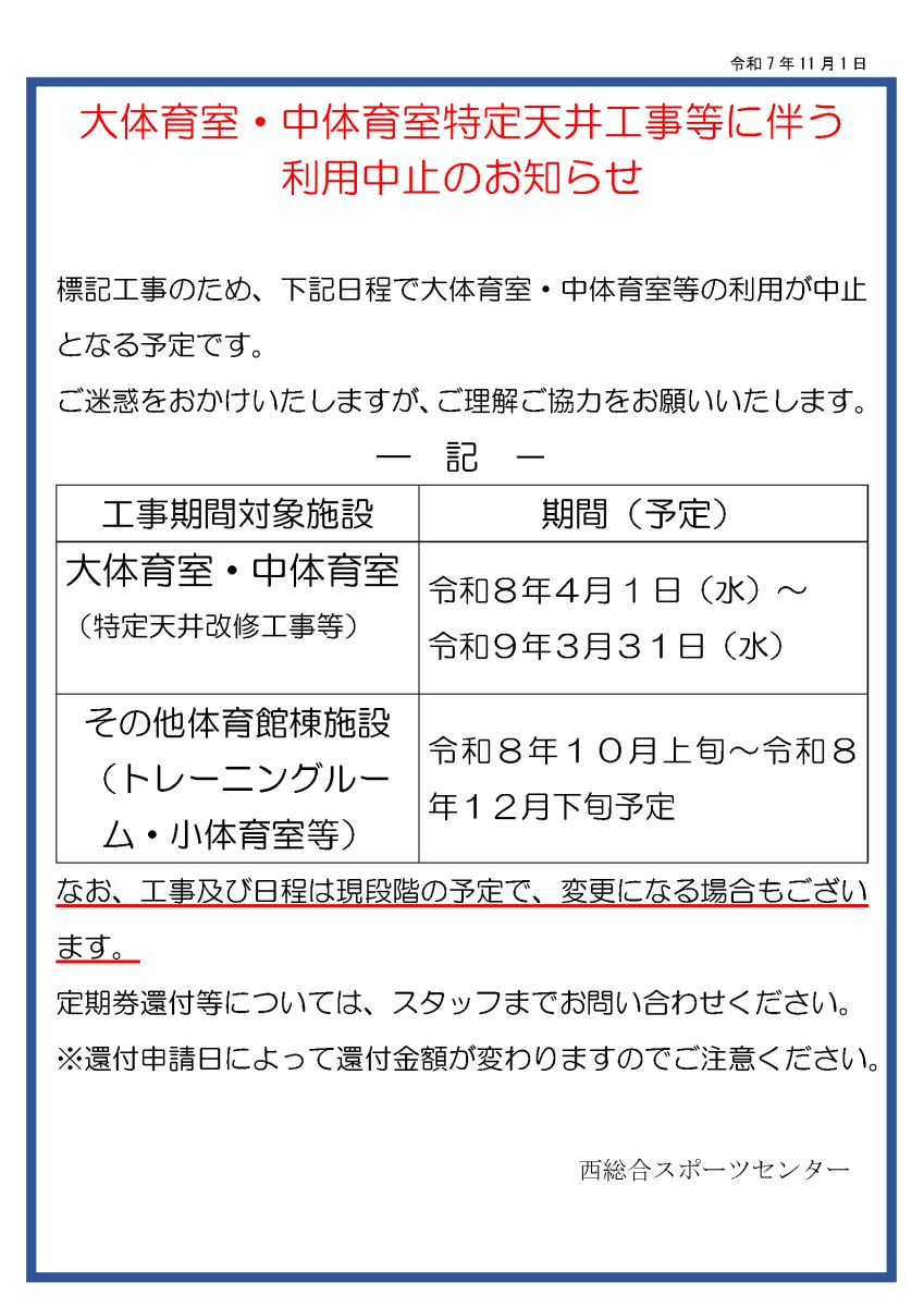 なお、これに伴いまして、令和8年度の体育館棟でのスポーツ教室の開催はございませんので