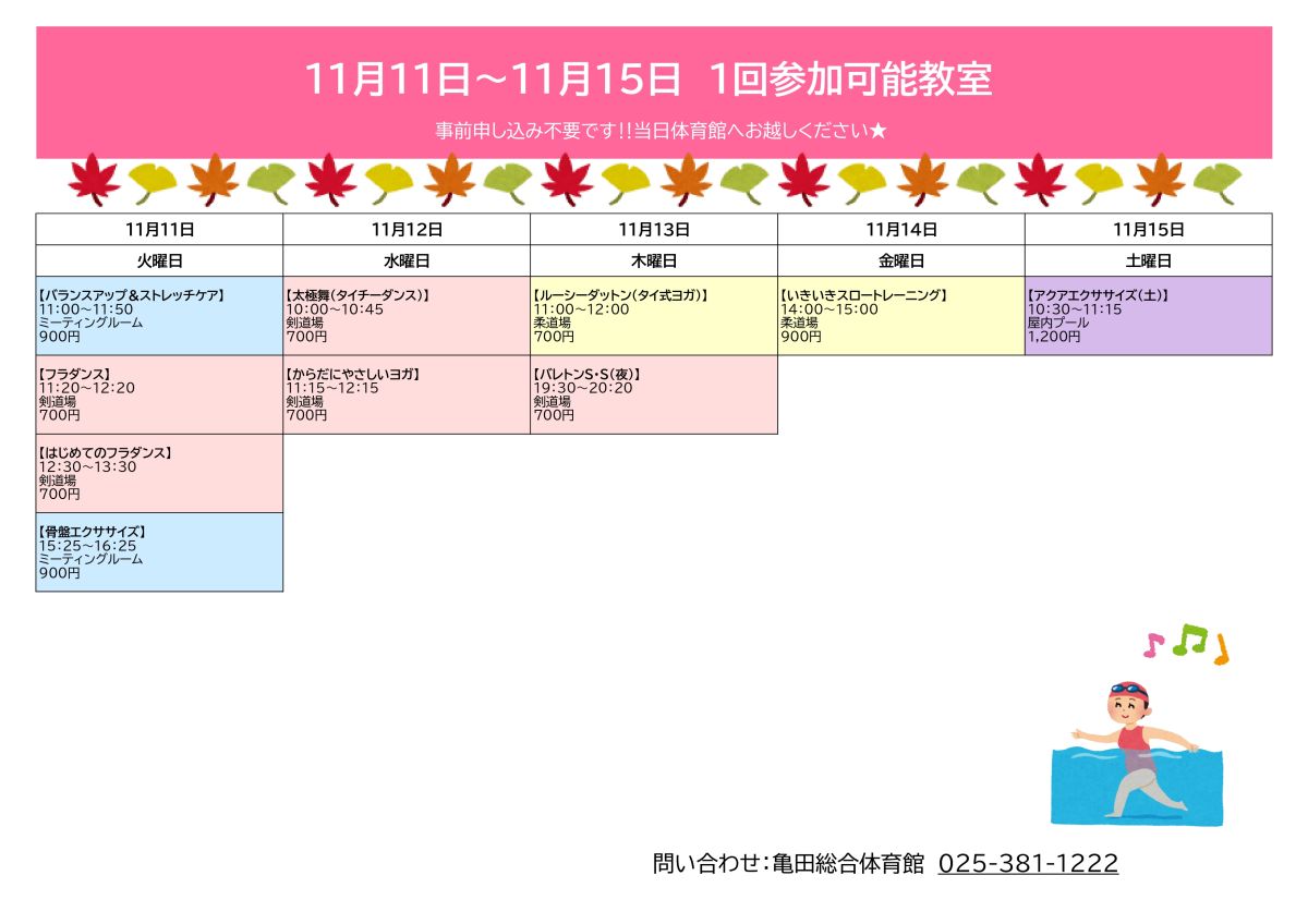 2025/11/09【11/11~11/15】スポーツ教室1回参加可能教室のお知らせ