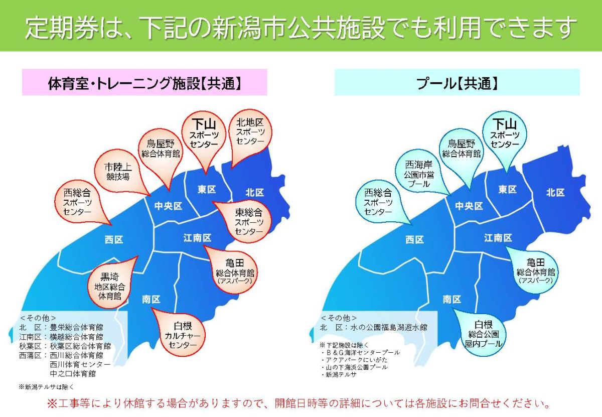 ・新潟市公共スポーツ施設の同類室場でそれぞれ共通してご利用いただけます。(下記参照)