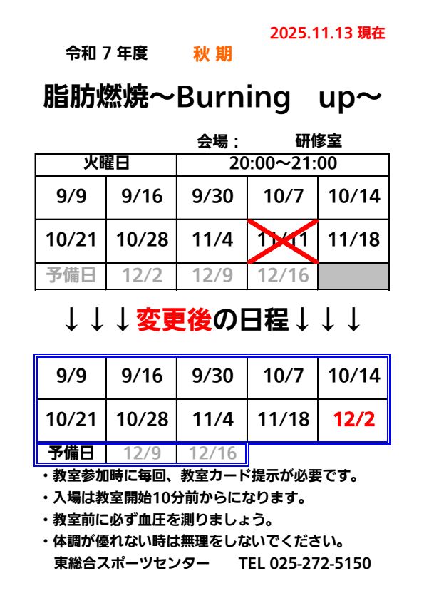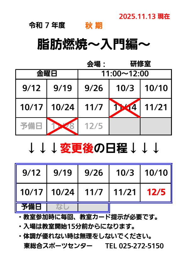2025/11/13(重要)【東総合】『脂肪燃焼プログラム』休講振替についてのお知らせ!!