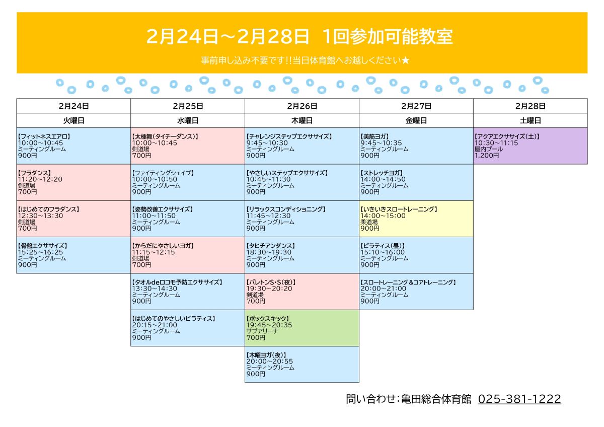 2026/02/22【2/24~2/28】スポーツ教室1回参加可能教室のお知らせ
