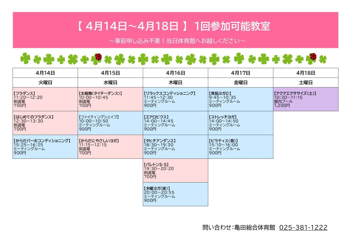 2026/04/12【4/14~4/18】スポーツ教室 1回参加可能教室のお知らせ